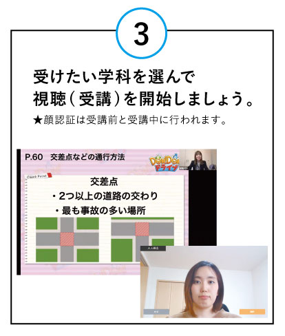 「オンライン学科」教習を受けるには、次の3つの手順が必要です。