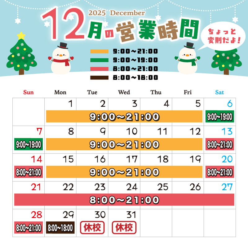 2025年12月営業時間のお知らせお知らせ2025/11/30 2025年12月の営業時間。 ※変則的なスケジュールになっております。ご確認よろしくお願いいたします。 ご不便をおかけいたしますが、何卒よろしくお願い致します。 前のページへ 一覧に戻る 次のページへ 入校に関するお問合わせ お電話でのお問合わせ 0120-154-307 ※タップするとそのままお電話いただけます。 営業時間 平 日 9:00-21:00 土日祝 9:00-19:00 休校日 年末年始・GW 2、3月の日曜日 フォームからのお問合わせ お問合わせ 入校申し込み