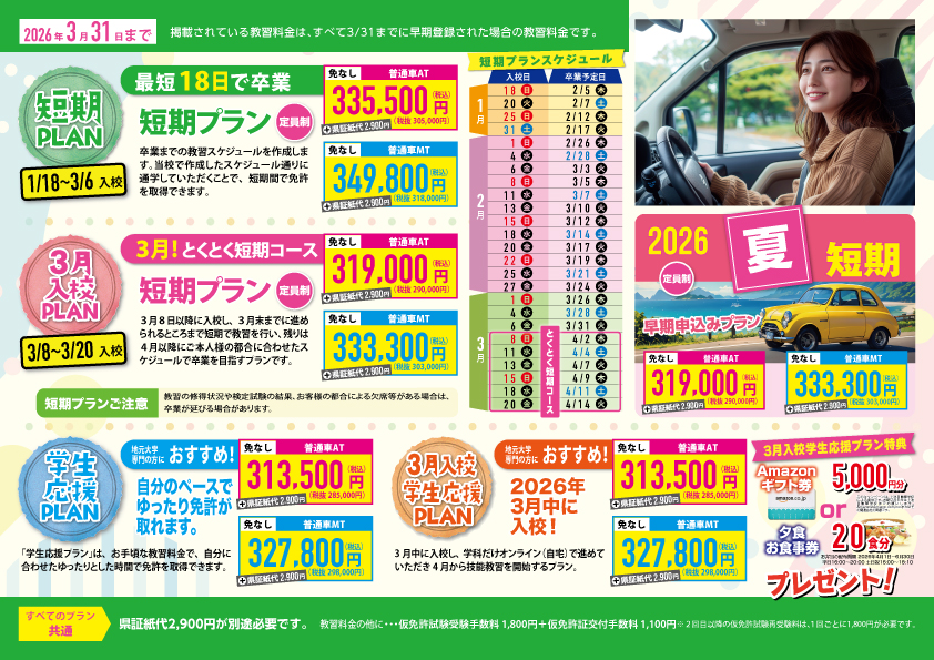 3月末までに進められるところまで教習を行い、4月以降はご本人様の都合に合わせたスケジュールで卒業を目指すプランです。