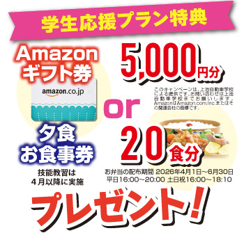 学生応援プラン限定特典「夕食お食事権20食分」or「Amazonギフト券」をプレゼント。